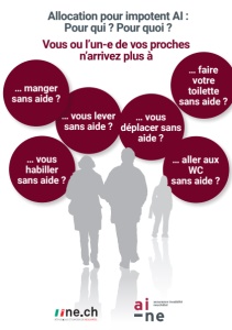 Si vous vivez en Suisse, que vous souffrez d’une atteinte à la santé physique, mentale ou psychique et que vous avez besoin d’une aide régulière, importante et permanente de tierces personnes pour accomplir des actes ordinaires de la vie, donc pour Faible Vous avez besoin • d’une aide régulière* et importante** pour accomplir au moins 2 actes de la vie quotidienne, ou • d’une surveillance personnelle permanente***, ou • de soins particulièrement astreignants en raison de votre infirmité, ou • de l’aide d’un tiers pour entretenir des contacts sociaux avec votre entourage parce que vous souffrez d’une grave atteinte des organes sensoriels ou d’une grave infirmité corporelle, ou • d’un accompagnement durable pour faire face aux nécessités de la vie****. Cas particulier : les personnes atteintes de paraplégie totale, les personnes assurées sourdes ou gravement handicapées de la vue ne font pas l’objet d’une enquête d’impotence. L’allocation pour impotent de degré faible leur est attribuée d’office. Moyen Vous avez besoin • d’une aide régulière* et importante** pour accomplir au moins 4 actes de la vie quotidienne, ou • d’une aide régulière* et importante** pour accomplir au moins 2 actes de la vie quotidienne ET d’une surveillance personnelle permanente***, ou • d’une aide régulière* et importante** pour accomplir au moins 2 actes de la vie quotidienne ET d’un accompagnement durable pour faire face aux nécessités de la vie****. Grave Vous avez besoin • d’une aide régulière* et importante** pour accomplir TOUS les actes de la vie quotidienne, ET • de soins permanents, ou • d’une surveillance personnelle permanente***. Cas particulier : les personnes sourdes aveugles et sourdes gravement handicapées de la vue ne font pas l’objet d’une enquête d’impotence. L’allocation pour impotent de degré grave leur est attribuée d’office. - vous habiller, vous déshabiller - vous lever, vous asseoir, vous coucher - manger * Besoin d’aide presque chaque jour. ** Besoin d’aide pour accomplir au moins une fonction partielle d’un acte de la vie quotidienne (p. ex. « faire sa toilette » comprend plusieurs fonctions partielles (se laver, se coiffer, se raser, prendre un bain ou se doucher). *** Vous ne pouvez pas être laissé·e seul·e sans risquer de mettre en danger vous-même ou des tiers. À préciser que dans les hôpitaux, les foyers et les institutions spécialisées, la plupart des personnes sont sous surveillance générale et collective. Il ne s’agit pas d’une surveillance personnelle permanente. **** Vous devriez être placé·e en home/foyer si vous n’aviez pas d’aide pour vivre de manière indépendante, pour entretenir des contacts sociaux ou pour éviter un isolement du monde extérieur (ce critère s’applique uniquement si vous vivez à domicile). - faire votre toilette - aller aux toilettes - vous déplacer (dans la maison et à l’extérieur), vous pouvez demander une allocation pour impotent AI. À noter que vous devez être considéré·e comme impotent·e depuis une année au moins pour y avoir droit. Si vous avez droit à une allocation pour impotent de l’assurance-accidents ou de l’assurance militaire, vous ne pouvez pas prétendre en complément à une allocation pour impotent versée par l’AI. Il existe trois degrés d’allocations pour impotent AI :